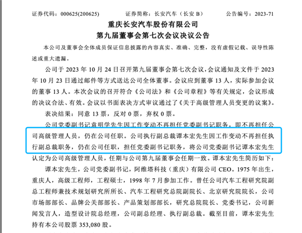在这此前的10月末,长安汽车就曾发布公告称,谭本宏因工作变动不再担任执行副总裁一职,但仍在公司任职,担任党委副书记,并将其认定为公司高级管理人员,任期与公司第九届董事会任期一致。