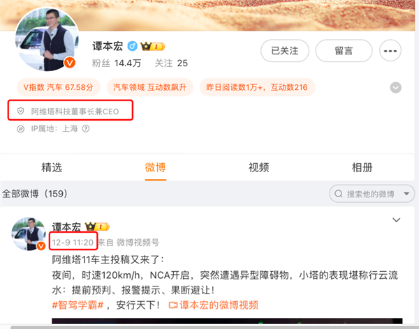 天眼查显示,目前阿维塔科技的法定代表人还是谭本宏,其个人微博的认证也还是阿维塔科技董事长兼CEO,其最近一条微博发布于12月9日,内容仍和阿维塔汽车相关。