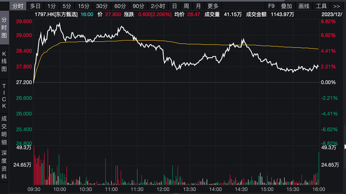 12月14日港股收盘,东方甄选收报27.8港元,涨幅自今日高点约8%缩至2.21%。昨日收盘公司股价下跌12.96%,报收27.2港元,总市值276.1亿港元。