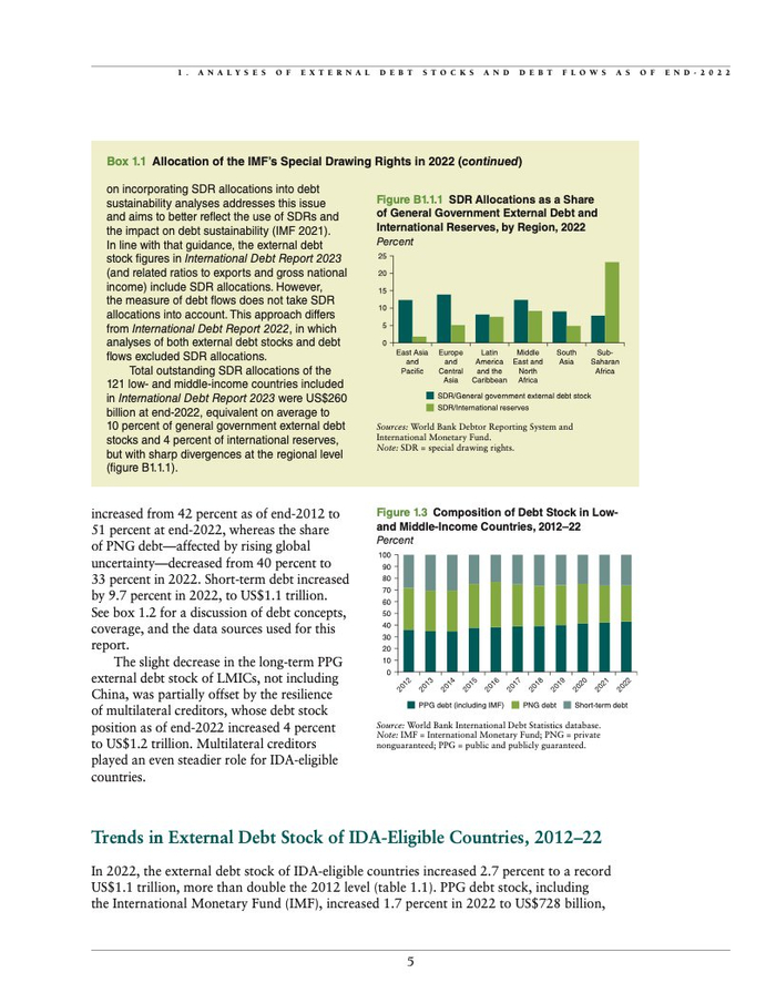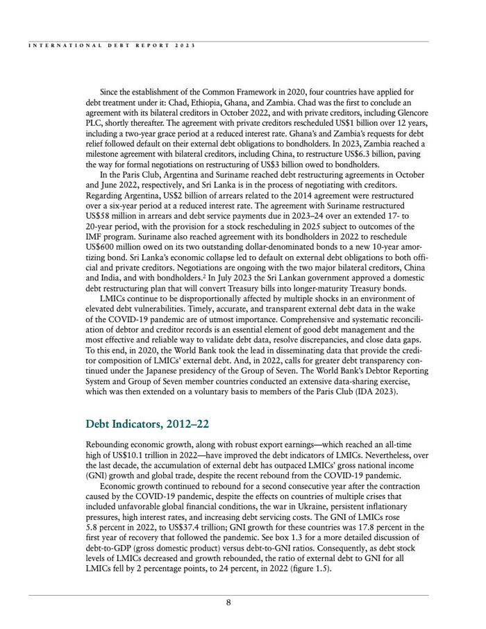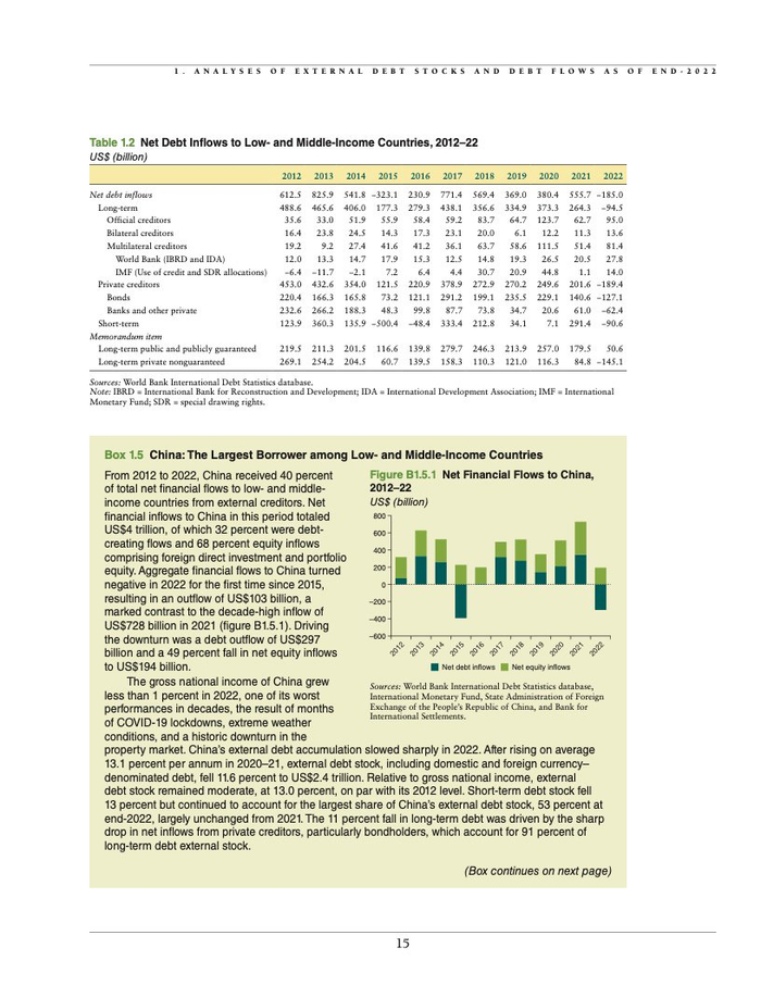 2022年,面对私人债权人无力为发展中国家提供融资的局面,世界银行和其他多边开发银行纷纷行动起来,帮助填补这一空缺。在该年,多边债权机构共向发展中国家提供了总额达1150亿美元的低成本融资,其中约占一半的资金源自世界银行。世界银行透过国际开发协会(IDA)为这些国家提供的新融资金额已超过它们所偿还的本金,达到169亿美元,几乎是十年前同等金额的三倍。此外,世界银行还向这些国家提供了61亿美元的无偿援助,相比2012年增加了三倍。