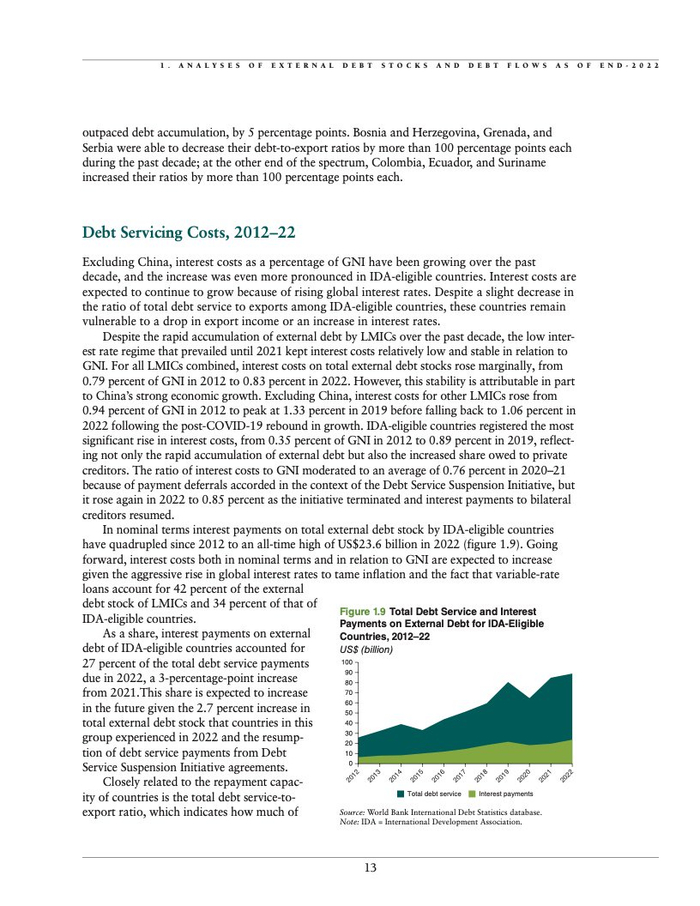 全部发展中国家的偿债支出(包括本金和利息)比上一年增加了5%。2022年75个国家有资格从世行支持最贫困国家的国际开发协会(IDA)借款,其偿债支出达到创纪录的889亿美元。过去十年中,这些国家的利息支出翻了两番,2022年达到236亿美元的历史最高水平。报告发现,2023年和2024年24个最贫困国家的总体偿债成本预计会激增,增幅高达39%。