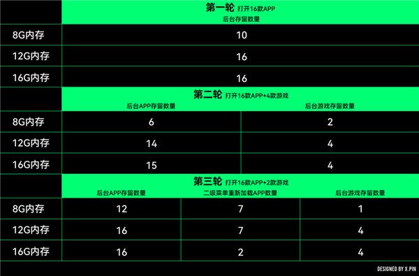 最后一轮则是最贴近真实使用的测试,我们会把 16 个 App 的每一个都点进二级菜单用一用,最后观察整体的后台驻留情况。