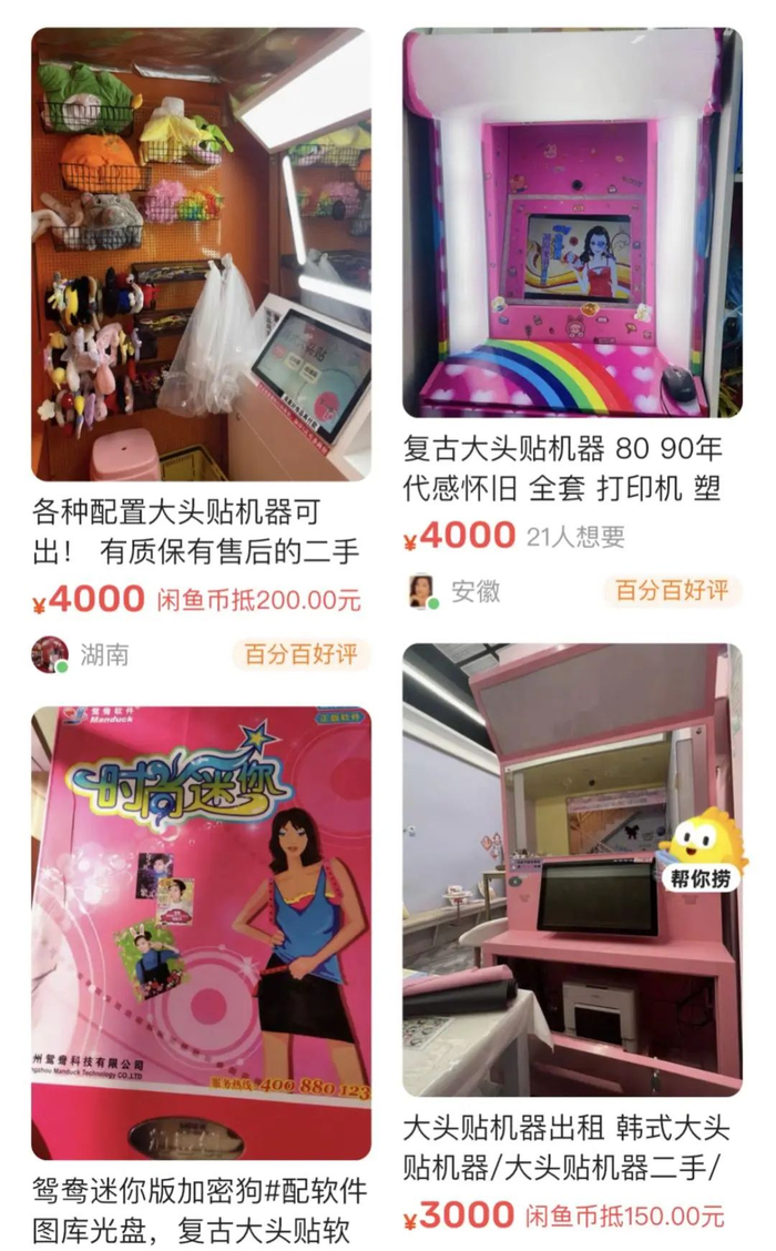 惊蛰研究所在闲鱼平台上看到有不少卖家在出售二手大头贴机器,出让理由大多为商场租期到期、涨租不续租,又或是没时间经营门店之类。根据介绍,这些二手大头贴机器的配置也大同小异,大多为佳能相机搭配西铁城的打印机。