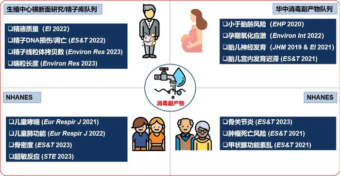 消毒副产物(Disinfection By-Products,DBPs)是在自来水处理过程中, 消毒剂(氯、氯胺等)与水中天然有机物或无机物发生化学反应而生成的一系列化合物。DBPs多达百余种,其中以三卤甲烷(Trihalomethanes,THMs)和卤代乙酸(Haloacetic acid,HAAs)含量最高,分别占比所有消毒副产物的66%和27%。人群可通过饮水、洗浴、游泳等用水活动暴露消毒副产物。毒理学研究发现三卤甲烷和卤代乙酸具有致癌、致畸、致突变等作用,因此并被世界卫生组织列为2B类致癌物。汪一心研究团队(Reproductive and Environmental Nexus for Extended Wellness,RENEW Lab)聚焦研究消毒副产物的生殖健康及远期健康效应,相继建立了华中生殖中心横断面研究和精子库队列,以血液三卤甲烷和尿液卤代乙酸浓度为个体内暴露标志物,发现消毒副产物暴露可能会导致男性精液质量参数下降、精子DNA损伤、细胞凋亡、精子线粒体拷贝数减少和端粒长度缩短。为深入研究消毒副产物对妊娠结局的影响,该团队还在华中地区建立了消毒副产物队列,在国际上首次报道了不同孕期消毒副产物暴露可导致孕期氧化应激水平上升、小于胎龄儿发生风险增加、胎儿神经发育受损和宫内发育迟滞。为进一步探讨消毒副产物暴露的远期健康效应,RENEW Lab进一步利用美国NHANES数据库,在国际上首次报道了三卤甲烷暴露可能会导致青少年超敏反应、哮喘和肺功能低下,以及成年甲状腺功能紊乱、肿瘤死亡风险增加。研究成果已陆续发表在环境或医学领域高水平期刊,如Eur Respir J(2篇, IF=24.3)、EHP(IF=10.3)、ES&T(6篇, IF=11.4)、Environ Int(3篇, IF=11.8)、J Hazard Mater (IF=13.6)等。