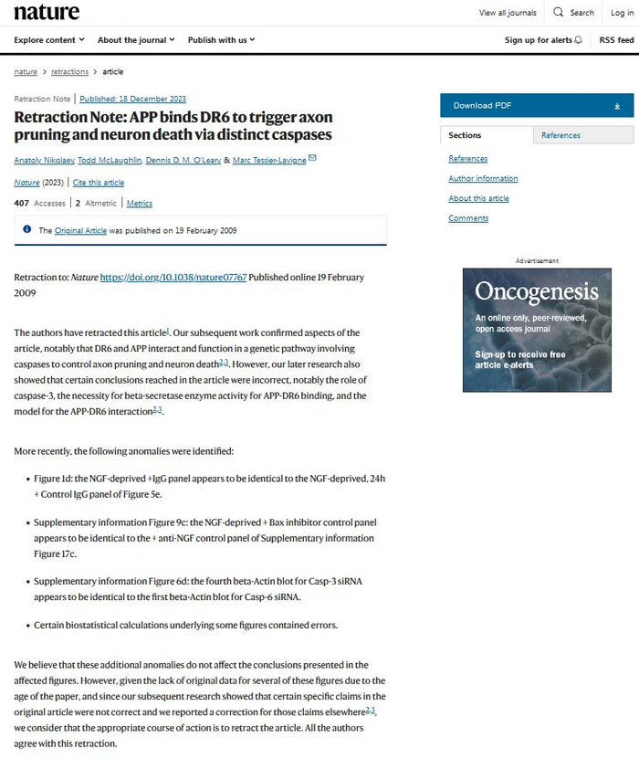 12月18日,《自然》期刊在线发表的撤回声明称,作者们撤回涉事论文。后续研究证实了该论文中的一些观点,同时也显示,涉事论文的一些结论是不正确的,尤其是关于半胱天冬酶-3(caspase-3)的作用、APP-DR6结合需要beta分泌酶活性以及APP-DR6相互作用的模型。