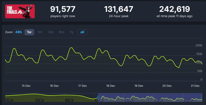 自12月8日正式开服以来,免费FPS游戏《The Finals》的人气可谓火爆,尽管Steam好评率不算太高,但游戏上线首日峰值在线便超过20万人,半个月过后依旧保持着不错的势头,能与常年霸榜的《Apex英雄》和《绝地求生》掰一掰手腕。