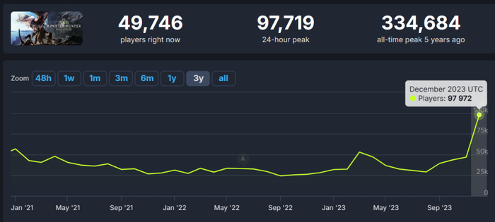 虽然近期没有任何实质性的更新,但《怪物猎人:世界》这段时间的玩家数稳步上升,在线人数于12月20日达到97972人,刷新过去三年内的最高纪录。