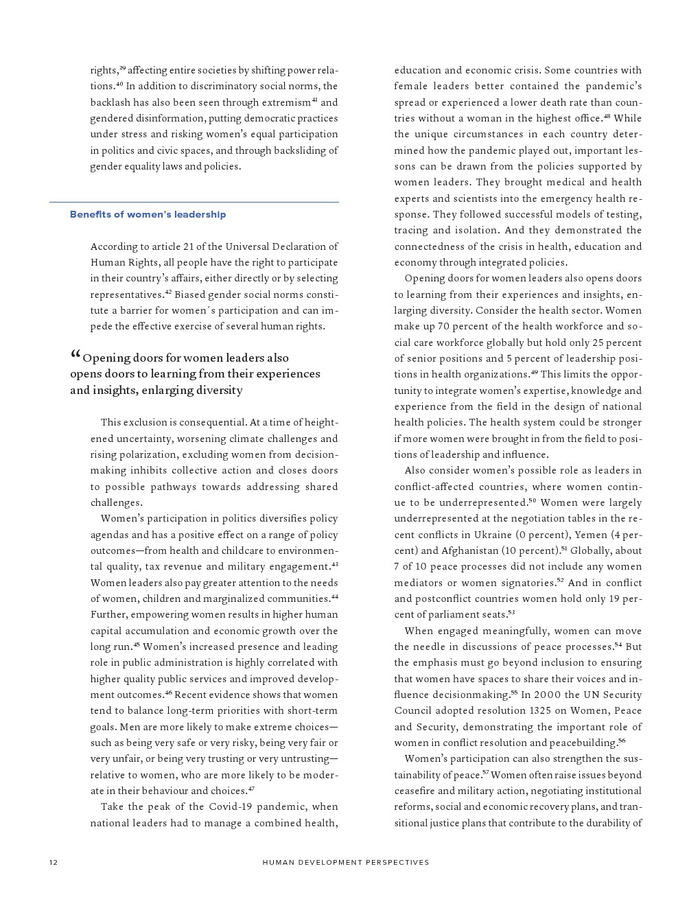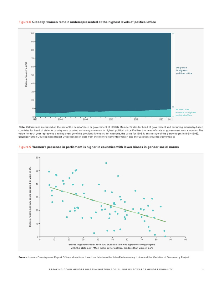 有偏见的性别社会规范还阻碍了女性成为领导者。尽管大多数国家已经消除了妇女担任政治职务的许多正式障碍,但政治代表性方面的性别差距仍然很大。自1995年以来,女性在全球国家元首或政府首脑中所占的比例平均保持在10%左右,女性在全球议会席位中所占比例略高于1/4,女性领导者往往比男性同行受到更严厉的评判。