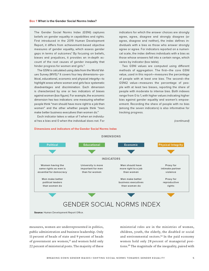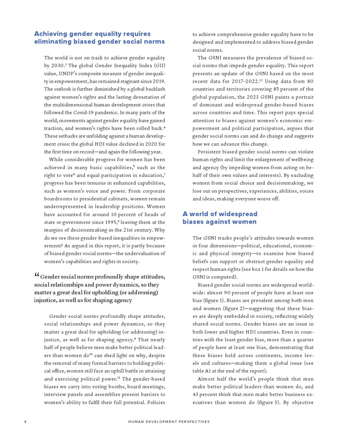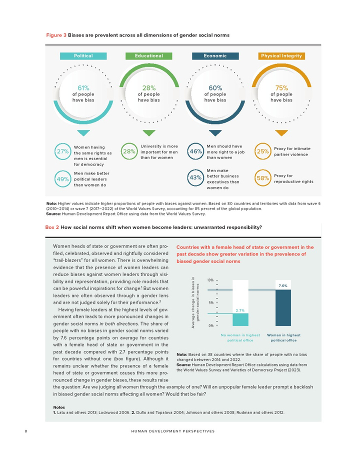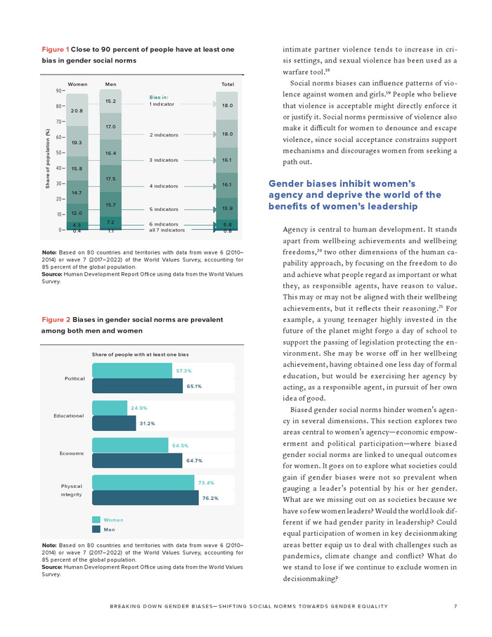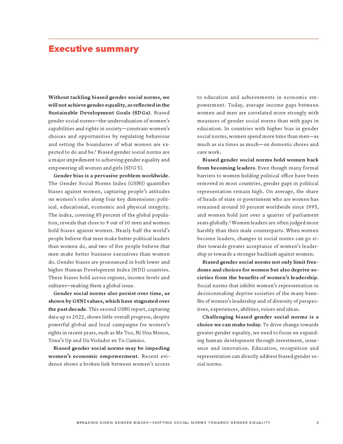 联合国开发计划署发布了“2023年性别社会规范指数”。如果不解决有偏见的性别社会规范,我们就无法实现可持续发展目标所体现的性别平等。有偏见的性别社会规范(低估女性在社会中的能力和权利)通过规范行为和设定女性应该做什么和成为什么人,限制了女性的选择和机会。有偏见的性别社会规范是实现性别平等和增强所有妇女和女童权能(可持续发展目标5)的主要障碍。