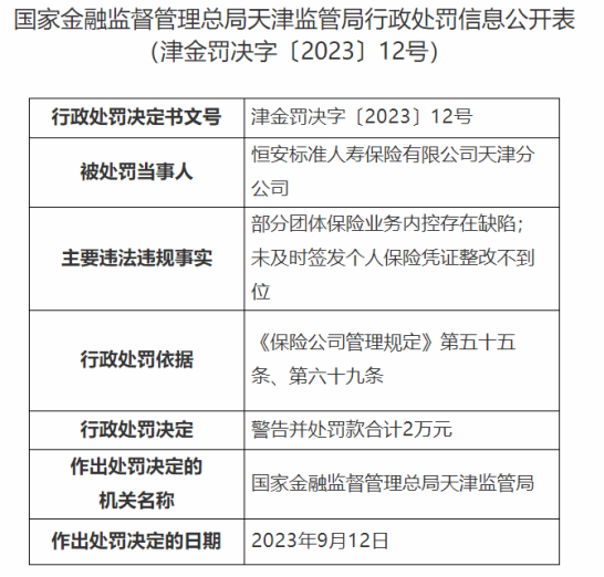 此外,引人注意的是,今年9月12日,国家金融监督管理总局天津监管局公布了一则行政处罚信息,文件显示,恒安标准人寿保险有限公司天津分公司因部分团体保险业务内控存在缺陷,未及时签发个人保险凭证整改不到位的违规行为,被天津监管局警告并处罚款合计2万元。