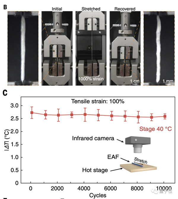 并且这种拉伸不会造成保温性能的损失,研究人员对EAF材料反复拉伸到10倍长度,重复一万次后温度并未发生明显变化。