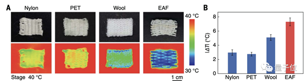 首先,研究人员测试了EAF未被加工成毛衣时的保温性能,并与常见的尼龙、涤纶(PET)、羊毛三种材料进行了对比。