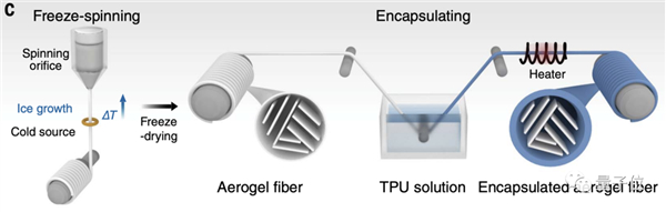 然后将壳聚糖溶液通过泵压入金属环孔,在环孔冷区中凝固成冰肪材料,再经过马达拉取成冻融纤维,就得到了EAF的内核。