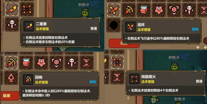 游戏内的法术模块种类丰富,除了能直接改变攻击特效的释放类法术,还有大量带有辅助特效的增强类法术。有的能改变法术范围,有的能改变子弹数量,有的能减少法术CD,还有的能让法术附带中毒或者冰冻特效。