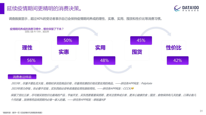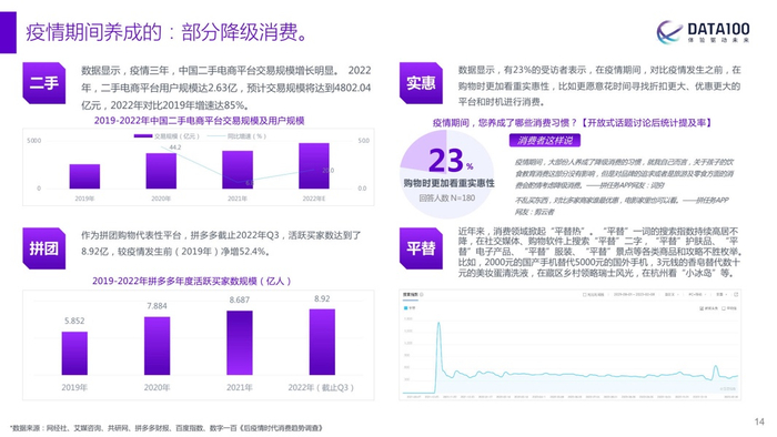 闲鱼、拼多多砍一刀近两年频频出圈,寻求更经济实惠,更节省的产品成为主流消费习惯。数字一百 DATA100 数据显示,有 23% 的受访者表示在疫情期间,对比疫情发生之前,在购物时更加看重实惠性,比如更愿意花时间寻找折扣更大、优惠更大的平台和时机进行消费。