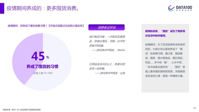 疫情期间,为了防范疫情带来的突然封控,大部分民众都养成了“囤货”的消费习惯。“囤货”表面上看囤的是物质资源,深层次其实是寻求安全感。数字一百 DATA100《后疫情时代消费趋势调查》显示,45% 调查者在疫情期间养成了囤货的习惯。