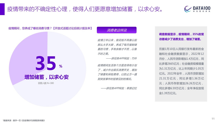 居民消费支出负增长既有疫情导致无法外出消费、网购物流不通等物理性原因,也有因为疫情影响收入下降,导致居民消费更加理性,避免不必要消费,同时为了追求安全感,还加强了资产储蓄。数字一百 DATA100 洞察显示,疫情期间,35% 的受访者减少了消费支出,增加了储蓄。