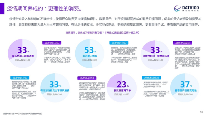 疫情带来收入和健康的不确定性,使得民众消费更加谨慎和理性。根据数字一百 DATA100 数据显示,63% 的受访者表示自己的消费变得更加理性,具体特征为量入为出不超前消费、有计划性的支出、少买非必需品、购物选择货比三家、更看重性价比、更看重产品的实用性等。