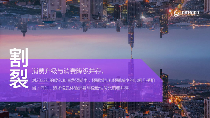 对 2023 年的收入和消费预期中,预期增加和预期减少的比例几乎相当;同时,追求悦己体验消费与极致性价比消费并存。经历疫情后更加看重品质、高质量的受访者分别为 30%、28%,另外有 25% 的受访者经历疫情后更加看重自由;在选择品牌时,对比知名品牌,会更青睐“满足我个性需求的品牌”。