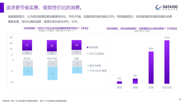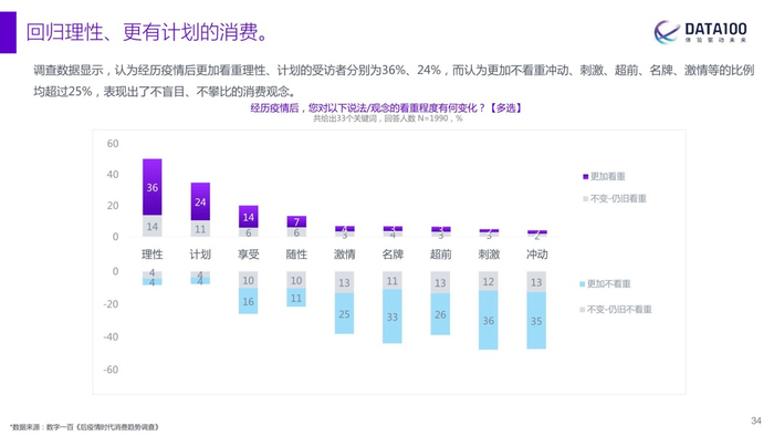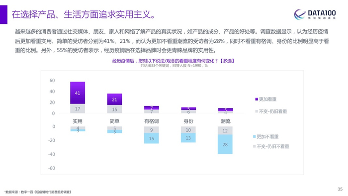 “回归理性、更有计划的消费”,“在选择产品、生活方面追求实用主义”成为疫情后消费者的主要消费倾向。根据数字一百 DATA100 数据显示,认为经历疫情后更加看重理性、计划的受访者分别为 36%、24%。55% 的受访者表示,经历疫情后在选择品牌时会更青睐品牌的实用性。