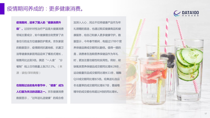 消费者更加注重身体健康也成为疫情带来的重要变化之一。数据显示,今年春节期间,有超过 1700 个营养保健品牌成交额同比翻倍。同时,消费者在选购营养保健品作为年礼时,更加注重功能性和实用性。