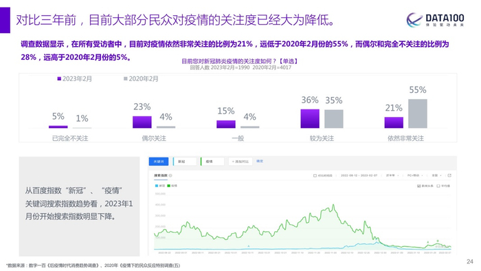 2022 年底至农历春节前,全国各地都经历了疫情感染高峰冲击,在近期已然恢复平静。数字一百 DATA100 数据显示,在所有受访者中,目前面对疫情情绪已经平静的占比为 49%,明显高于 2020 年 2 月份的 27%,同时面对疫情有恐惧、焦虑情绪的受访者占比也明显低于 2020 年 2 月份。