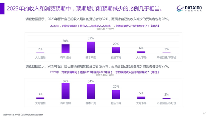 数字一百 DATA100 数据显示,2023 年预计自己的收入增加的受访者为 32%,而预计自己的收入减少的受访者也有 26%,由此可见,大部分人对自己收入增加的预期具有较大的不确定性。