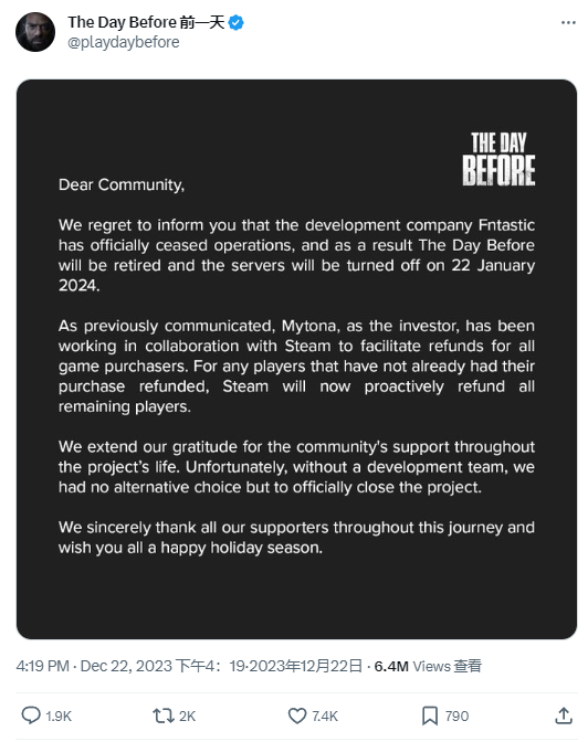 就在大家几乎要忘了这一切时,《浩劫前夕》官方推特数天前发推声称,FNTASTIC开发团队已经解散,他们的游戏将在明年1月22日关闭服务器。之前所保证的“继续添加游戏内容”想来也已经无从谈起。