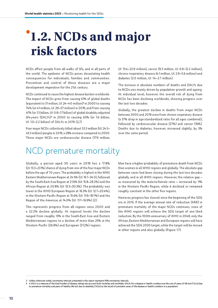世界目睹了人口和流行病学的迅速转变,每年由非传染性疾病造成的死亡所占比例已增长到占所有死亡的近3/4,如果这一趋势继续下去,预计到2048年世卫组织成立100周年时,这一比例将达到86%左右。联合国预计,到2048年全球每年死亡人数将达到近9000万人,其中7700万人是非传染性疾病死亡,绝对数字比2019年增长近90%。