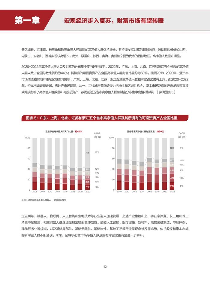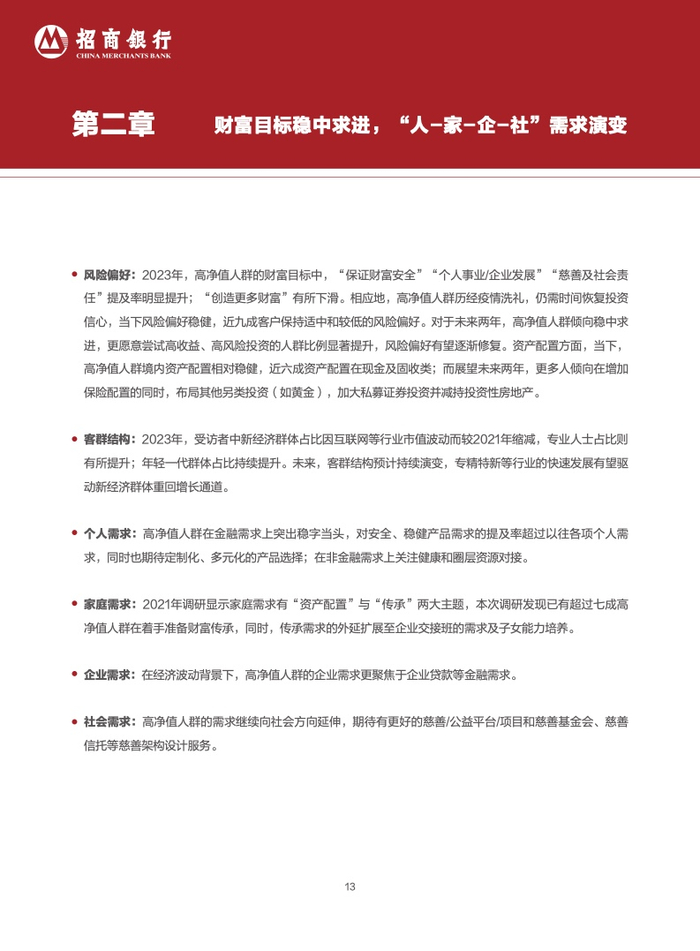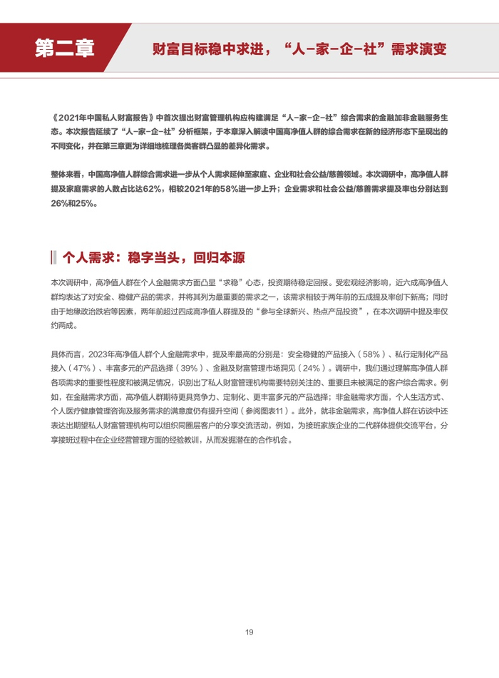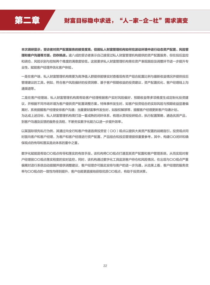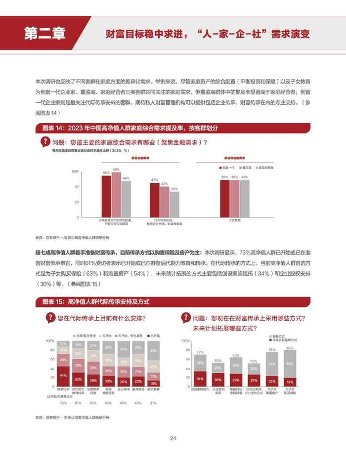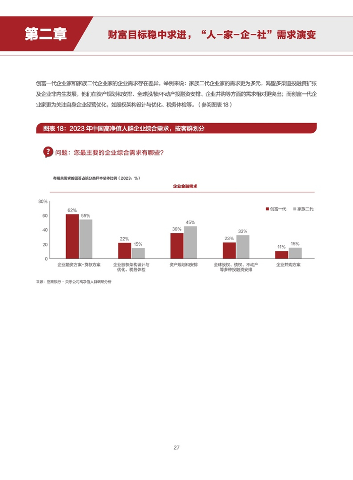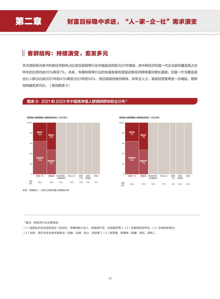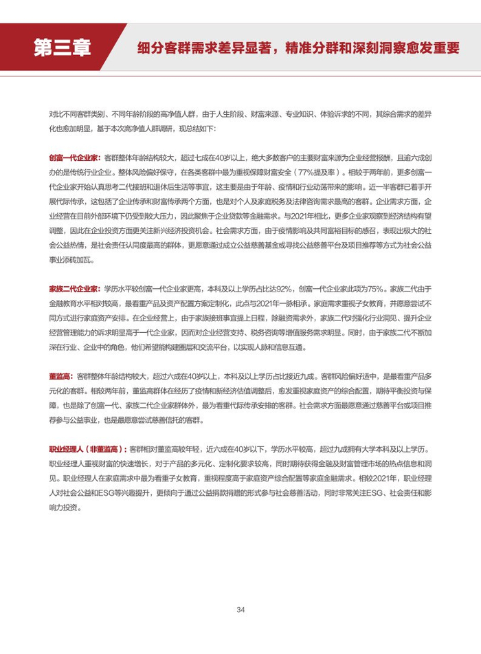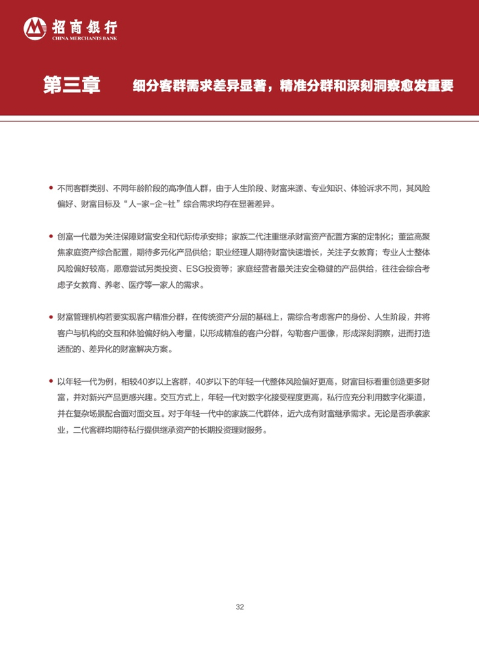本次调研受访者中的新经济群体占比因互联网等行业市值波动而较2021年缩减。未来,专精特新等行业的快速发展有望驱动新经济群体重回增长通道。从年龄分布来看,客群进一步年轻化。相较40岁以上客群,40岁以下的年轻一代整体风险偏好更高,财富目标看重创造更多财富,并对新兴产品更感兴趣。交互方式上,年轻一代对数字化接受程度更高,私行应充分利用数字化渠道,并在复杂场景配合面对面交互。对于年轻一代中的家族二代群体,近六成有财富继承需求。无论是否承袭家业,二代客群均期待私行提供继承资产的长期投资理财服务。