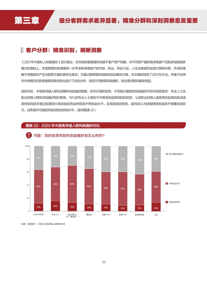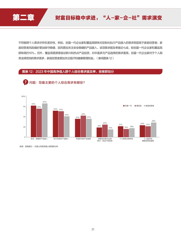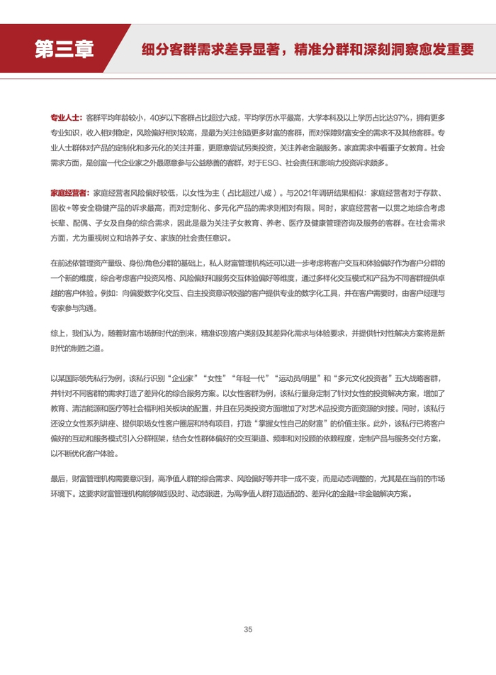 本次调研延续了2021年方法,并基于近两年市场情况对各类客群的需求变化进行了动态分析,发现不同客群综合需求差异越发明显。例如,创富一代更为看重财富传承、个人事业及企业发展;家庭经营者最关注子女教育;而专业人士则最关注创造更多财富。这就要求私人财富管理机构精细化客户分群,从而精准识别、洞察细分客群需求,并基于客户差异化需求提供定制化的金融及非金融综合解决方案。