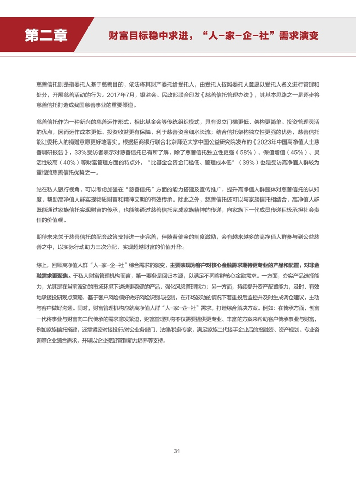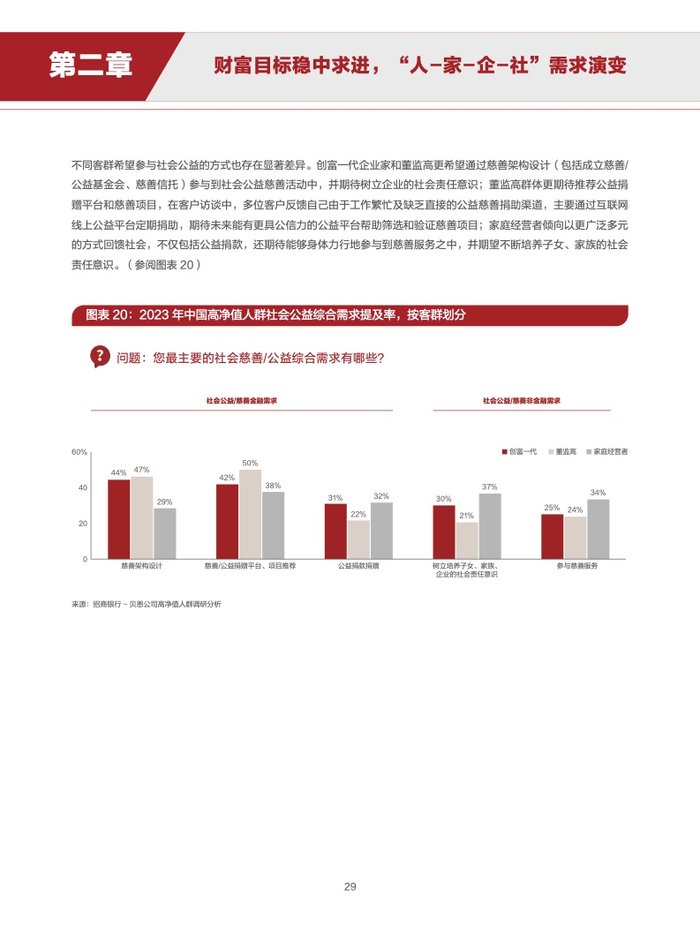 报告显示,高净值人群作为“先富”人群,积极响应号召,主动热心公益、践行慈善、回馈社会,其综合需求从专注于个人、家庭、企业,扩展到社会责任、公益和慈善领域。不同客群希望参与社会公益的方式存在显著差异。创富一代企业家和董监高更希望通过慈善架构设计(包括成立慈善/公益基金会、慈善信托)参与到社会公益慈善活动中,并期待树立企业的社会责任意识;董监高群体更期待推荐公益捐赠平台和慈善项目,在客户访谈中,多位客户反馈自己由于工作繁忙及缺乏直接的公益慈善捐助渠道,主要通过互联网线上公益平台定期捐助,期待未来能有更具公信力的公益平台帮助筛选和验证慈善项目;家庭经营者倾向以更广泛多元的方式回馈社会,不仅包括公益捐款,还期待能够身体力行地参与到慈善服务之中,并期望不断培养子女、家族的社会责任意识。针对高净值人群在公益慈善领域的需求,各类私人财富管理机构应各施所长,为客户提供差异化的解决方案。