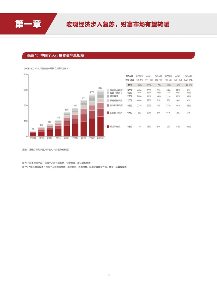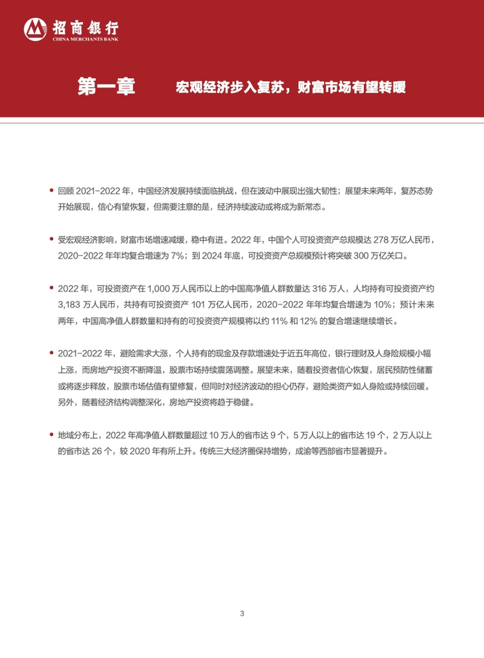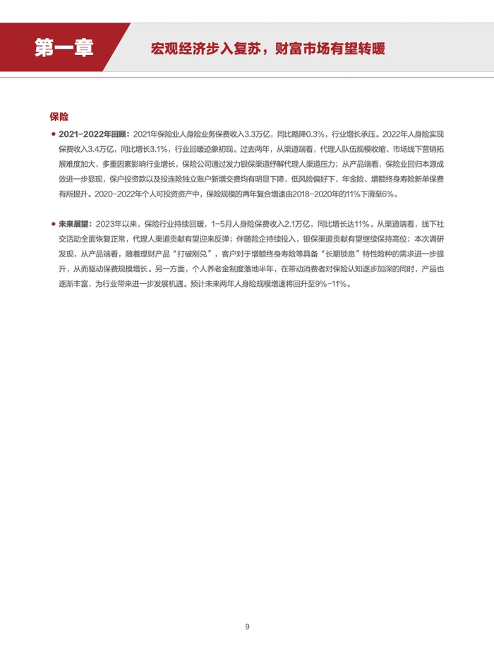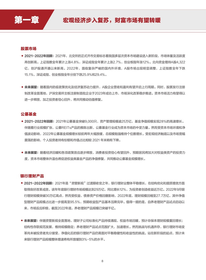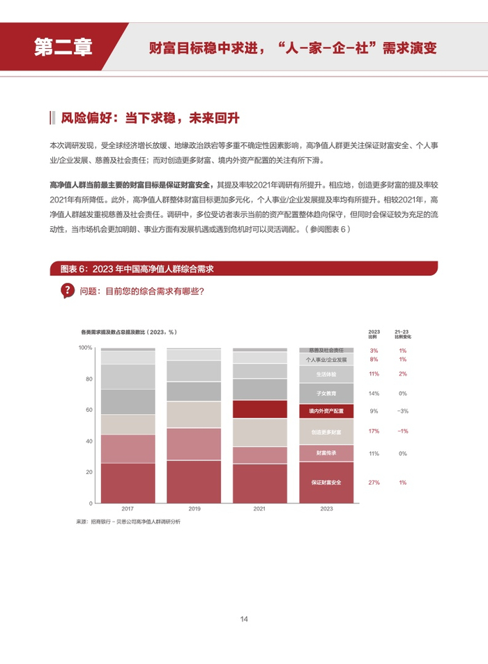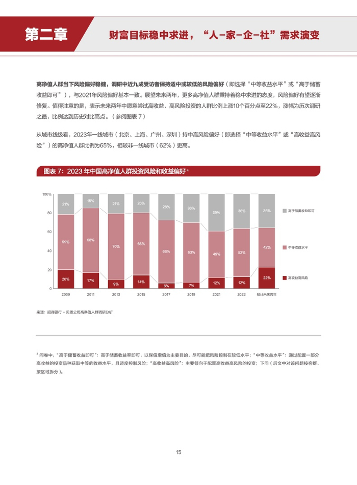 2023年,高净值人群的财富目标中,“保证财富安全”“个人事业/企业发展”“慈善及社会责任”提及率明显提升;“创造更多财富”有所下滑。相应地,高净值人群历经疫情洗礼,仍需时间恢复投资信心,当下风险偏好稳健,近九成客户保持适中和较低的风险偏好。对于未来两年,高净值人群倾向稳中求进,更愿意尝试高收益、高风险投资的人群比例显著提升,风险偏好有望逐渐修复。资产配置方面,当下,高净值人群境内资产配置相对稳健,近六成资产配置在现金及固收类;而展望未来两年,更多人倾向在增加保险配置同时,布局其他另类投资(如黄金),加大私募证券投资并减持投资性房地产。