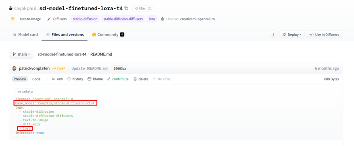 在 Hub 中,LoRA 可通过两个属性来识别: