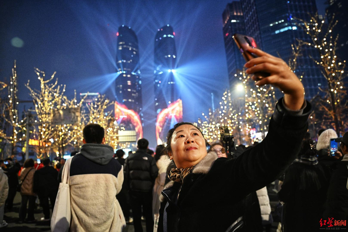 12月31日晚,开往天府双塔方向的地铁都是满满当当。在靠近双塔的街道内,挂满了彩灯、红灯笼,好一片节日胜景。双塔光影秀作为成都重要节日的“保留节目”,市民、游客们早早就赶到现场。临近18时,人们拿出手机“蓄势待发”。