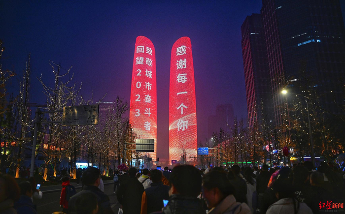 光影流动中,一个个普通市民的心愿“上墙”,有对2023的总结,也有对2024的希冀,这些声音,平凡而温暖。不同的人们从城市的各个角落齐聚双塔之下,一起迎新,共同跨年。