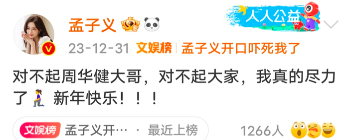 紧接着,#孟子义跑调很突出#成功登上热搜。孟子义也随即在微博发声,高情商的一句“对不起周华健大哥,对不起大家,我真的尽力了,新年快乐!!!”孟子义的回应,又马上成为网络热点。