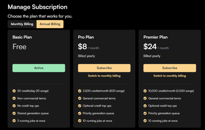 用户在官网登陆后即成为免费版本用户,每天可以使用 5 次提示,可生成 10 首歌曲。Suno 的盈利模式为会员订阅,每月支付 8 美元可生成 500 首歌曲,每月支付 24 美元的用户可生成 2000 首歌曲,同时还提供年度订阅折扣。