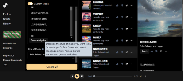 用户也可以在 Suno 生成的作品基础上进行进一步地编辑,比如修改歌词和音乐风格,或者生成一首完整的曲目。目前,用户还可以自己编写并上传歌词,选择想要的风格(如“情感乡村民谣”)来生成相应歌曲。