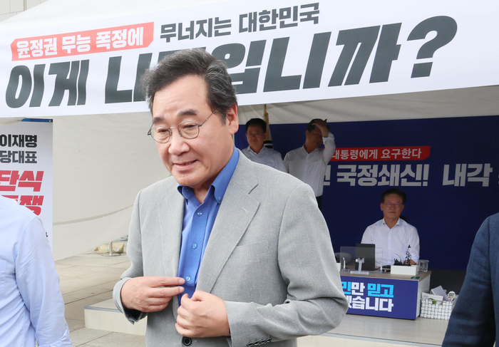 ▲2023年9月10日,韩国首尔,李在明静坐示威帐篷内进行绝食,韩国共同民主党原党首李洛渊(图中)等人前来探望后准备离开