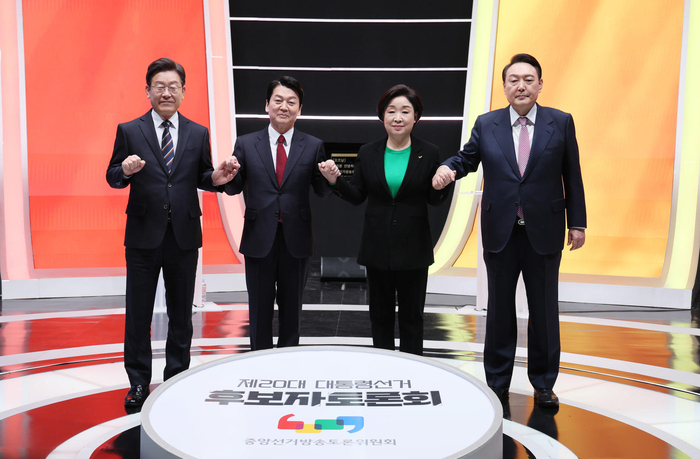 ▲2022年2月21日,韩国首尔,在第20届韩国总统选举一场电视辩论会上,共同民主党候选人李在明、国民之党候选人安哲秀、正义党候选人沈相奵、国民力量党候选人尹锡悦(从左至右)合影