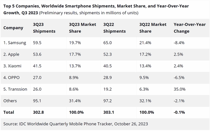 整体来看,全球手机出货量方面,三星、苹果、小米、OPPO牢坐TOP4的位置,排位次序一直很稳定。不过,作为黑马的传音,在2023年杀出,占据了手机出货量第五的位置。