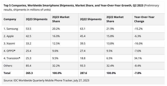 销量榜上排名靠前的头部玩家们,一直都是我们所熟悉的三星、苹果、小米、OPPO、vivo,2023年Q1的情况的确如此,虽然五大厂商都销量齐跌,但它们依然拿走了最大部分的市场份额。