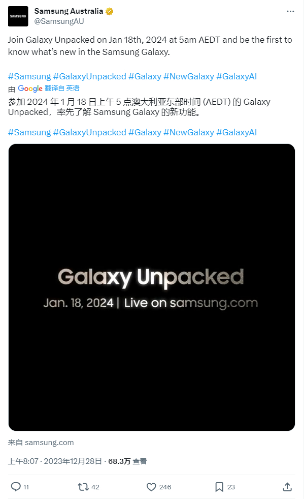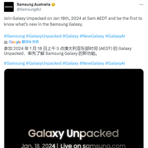 IT之家 1 月 2 日消息,三星澳大利亚官方确认将于北京时间 2024 年 1 月 18 日上午 2 点举行 Galaxy Unpacked 芯片发布会,带来 Samsung Galaxy 新功能。