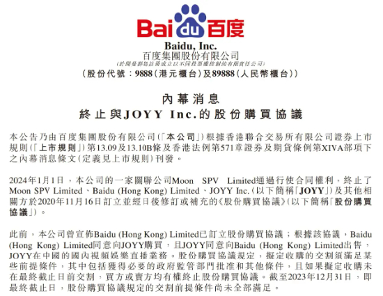 1月1日,百度发布公告,其关联方Moon将终止对YY直播的收购。据了解,该笔收购案交割的前提,是需要获得政府监管部门的批准。而百度公告指出,截至2023年末交割前提条件尚未全部满足。