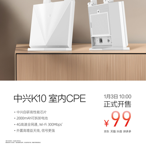 IT之家 1 月 3 日消息,中兴室内 CPE 路由器 K10 今日开售,首发 99 元。