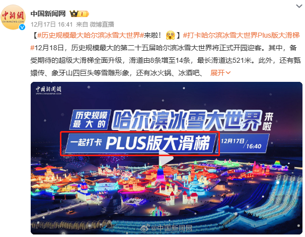 根据某旅游机构数据现实,在冰雪旅游线路中,哈尔滨冰雪大世界这个景点的上榜率很高,哈尔滨冰雪大世界热度环比上涨200%。12月14日,“冰雪大世界官宣开园日期”的词条就登顶热搜榜,曝光量高达1.7亿次。