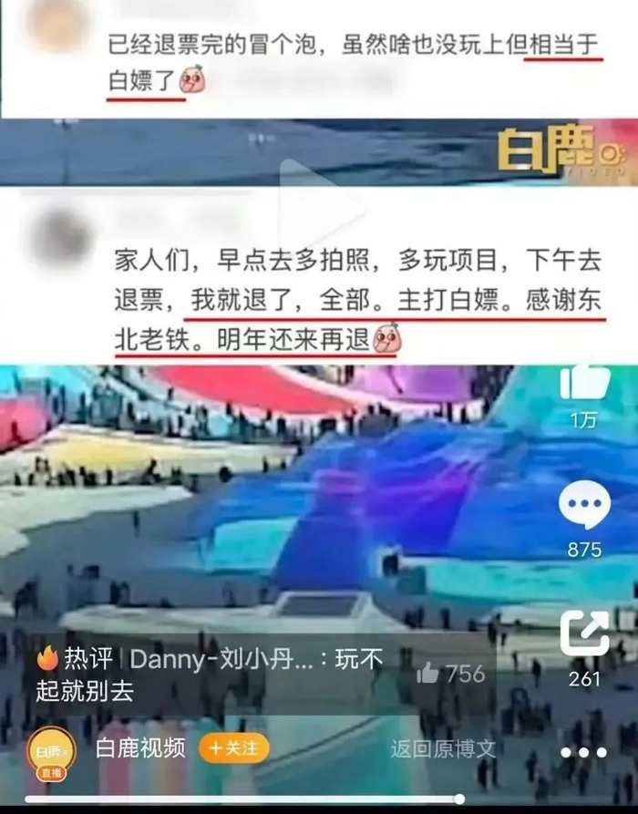 因为体验不好而退票,并不是完全无理的要求。奈何这其中参杂进了一些人看了冰雕、玩了滑梯、甚至一直玩到晚上,还要求全额退款的。