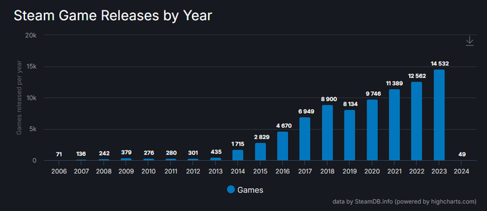 通过数据图可以看出,近十年来Steam上游戏发布长期处于上涨状态,在2021年已经破万,2023年的总上线数量则达到了1.4万以上,平均每天有39款游戏上架。