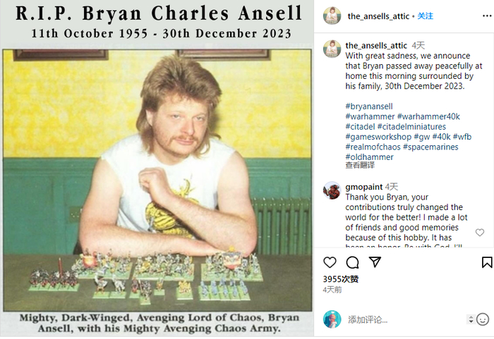 Games Workshop早期领导人物Bryan Ansell的妻子在今天通过社交账号宣布了他去世的消息。